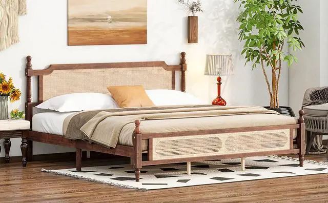 • King Pine wooden Bed with Rattan Headboard and Footboard, with Central Enhanced Bed Platform,Walnut