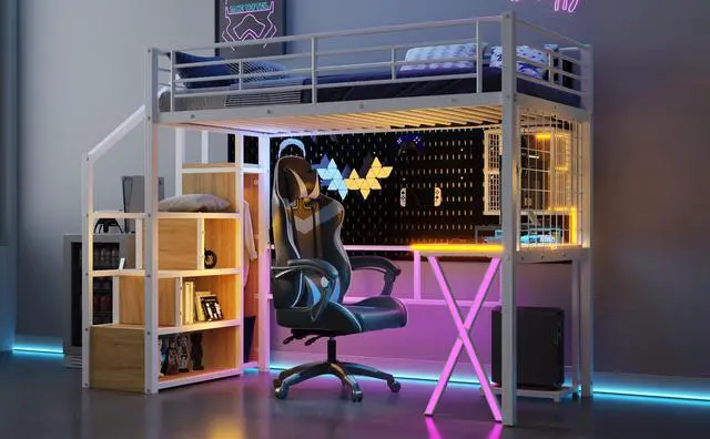 [LED Workstation] This loft bed includes a built-in desk, 2 storage shelves and 1 computer host shelf and 2 grid boards. With the LED light strips on the X-shaped table legs and the edges of desks and shelves, you can turn the underspace into a clever workstation, a reading nook or a craft area.
