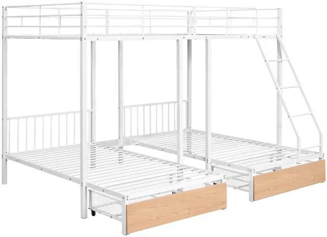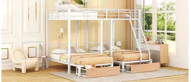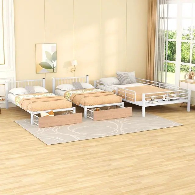 v [Multi-functional] This triple bed can be divided into three separate beds to meet your different needs. The shelf beside the upper full bed and the table between the two lower beds provide place for you to put some daily supplies within easy reach, and the two pull-out drawers under the lower beds save a space for you to store some clothes and toys.