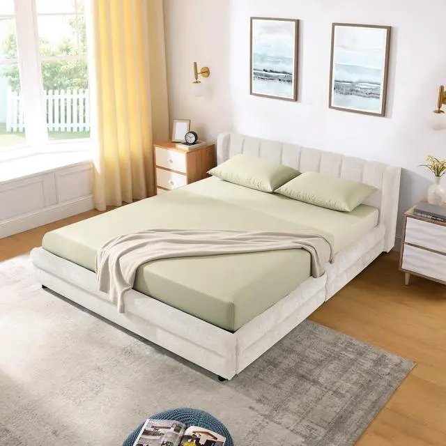 [Unique Grounded Queen Size Bed] - This grounded upholstered bed will be both a beautiful piece in the room and a place full of fun for your family. This beautiful modern queen bed frame adds a contemporary chic look to your bedroom and is upholstered in thick chenille fabric to add extra comfort.