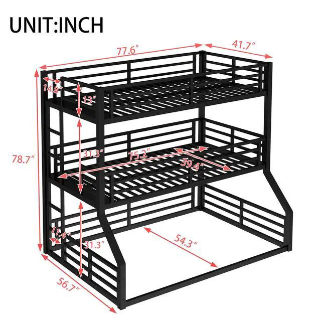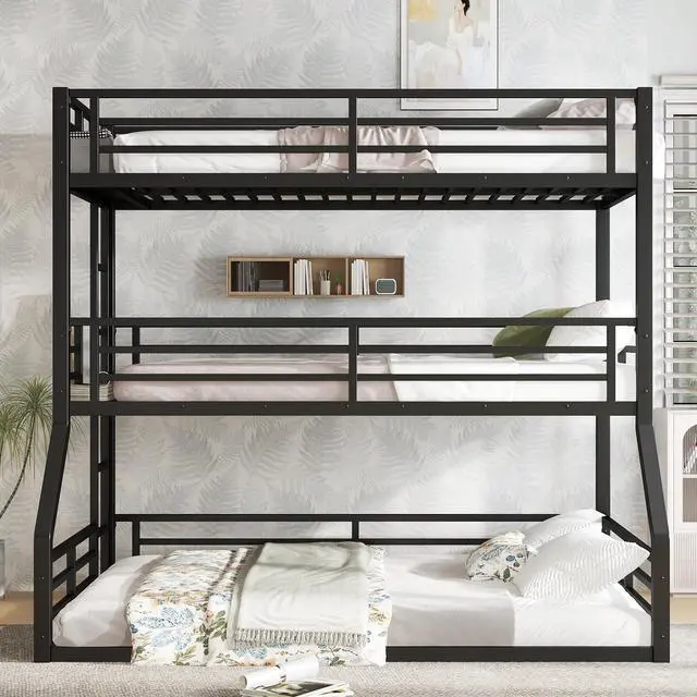 • Twin over Twin over Full XL Bunk Bed, Metal Triple Bunk Bed with Safety Guardrails, Heavy-duty Bunk Bed with Noise-reduced Design, Black