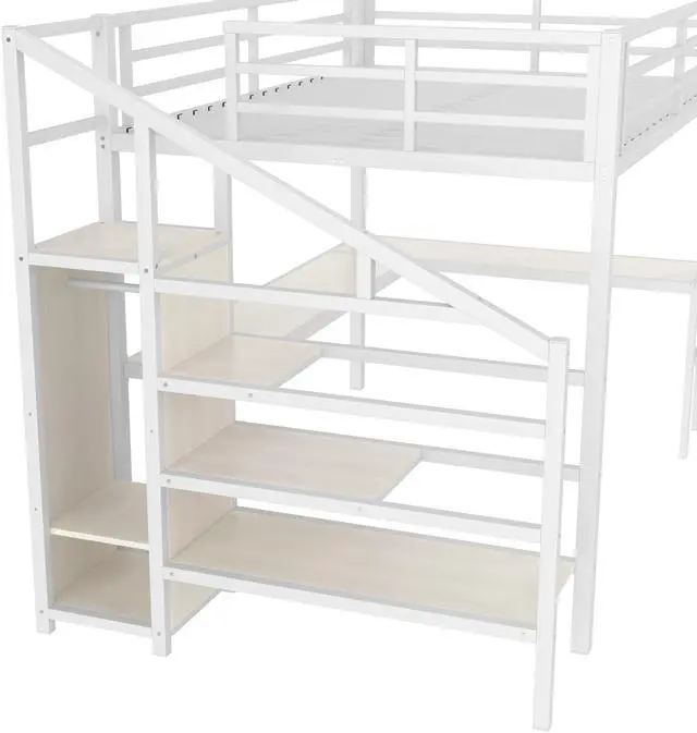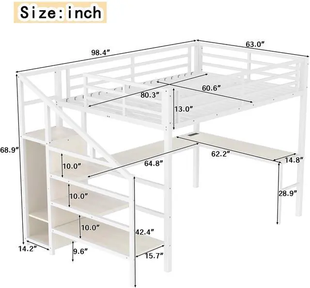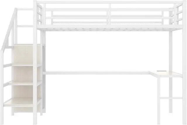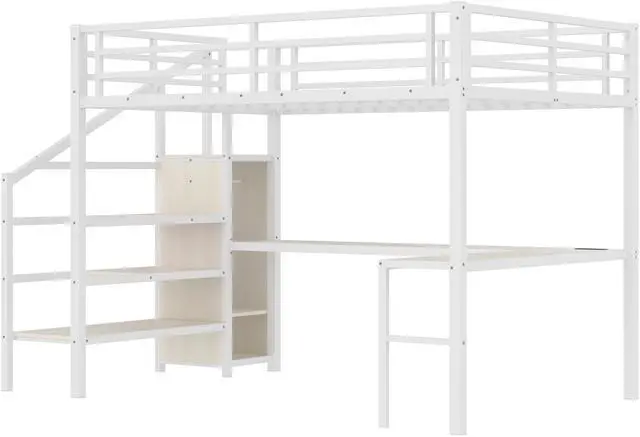 Solid Metal Loft Bed - The bed frame is made of metal for strength and stability, and the upper bunk can hold up to 350 pounds. Queen size loft bed frame comes with sturdy stairs so kids can safely climb to the upper bunk and full-length guardrails keep kids safe while sleeping.