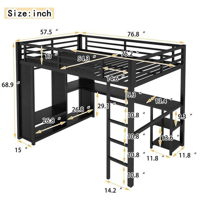 [Workstation and Storage] The bed comes with a desk that can be used for studying or working. The storage shelves next to the desk can hold most of the items you need for work or leisure.