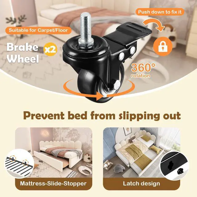 PEACE-ASSURING QUALITY The sofa bed is equipped with hardware clasps on both sides to secure the bed when not in use and keep your bedroom tidy. The slatted frame provides a solid sleeping experience and the pull-out bed is equipped with 4 casters, which have brakes for added safety. The pull-out bed comes with two stoppers to prevent the mattress from shifting.