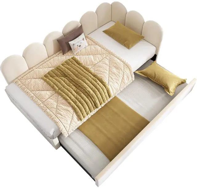 • Upholstered Bed Daybed With Pull-Out Bed, Twin Size Single Sofa Bed,Guest Beds For Adults and Children, Bed With Metal Slatted Frame, Velvet, Beige (Without Mattress)