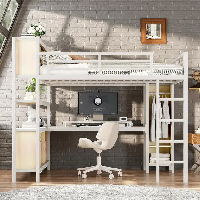 Queen Loft Bed with Wardrobe and Desk: This metal loft bed has a cozy sleeping space, a spacious and practical L-shaped desk that can be used as a workbench or reading area, and the wardrobe can provide a great place for your everyday clothes.
