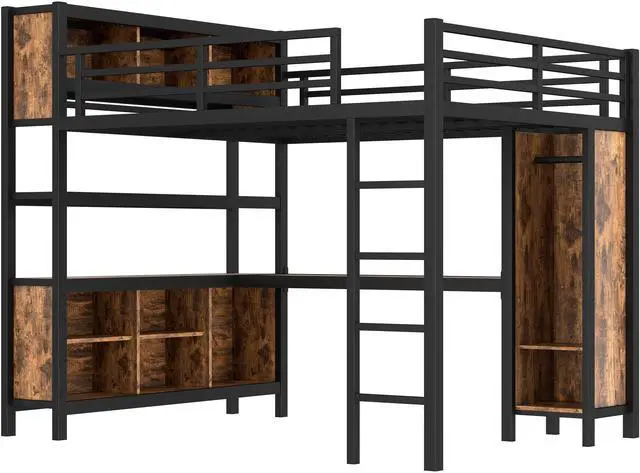 Queen Loft Bed with Wardrobe and Desk: This metal loft bed has a cozy sleeping space, a spacious and practical L-shaped desk that can be used as a workbench or reading area, and the wardrobe can provide a great place for your everyday clothes.