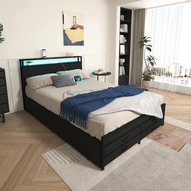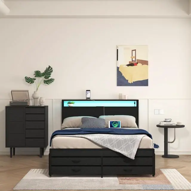 Smart LED Bed Frame Queen size with multifunctional LED lights strips, beautiful 16 RGB LED Light colors (There are over 60000 colors to choose from). You can freely set the brightness and color, mode and timing functions to create various scenes and make your life more intelligent.