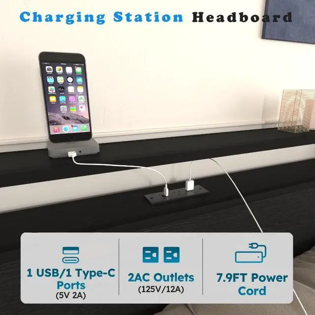 Storage Headboard with Charging Station 2 Standard Plug Outlets & 2 USB Ports with Cable Management 7.9 ft long power supply cord. Make charging and common small items such as phones, glasses, and books within easy reach.