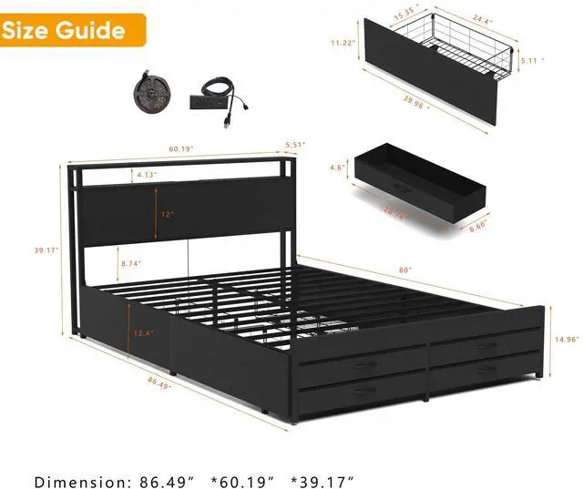 Easy to Assemble The Queen bed frame with storage drawers is well packaged and comes in one box. Complete instructions book and numbered parts, so you don't have to spend too much time to install it, it only takes 45 minutes to easily complete.
