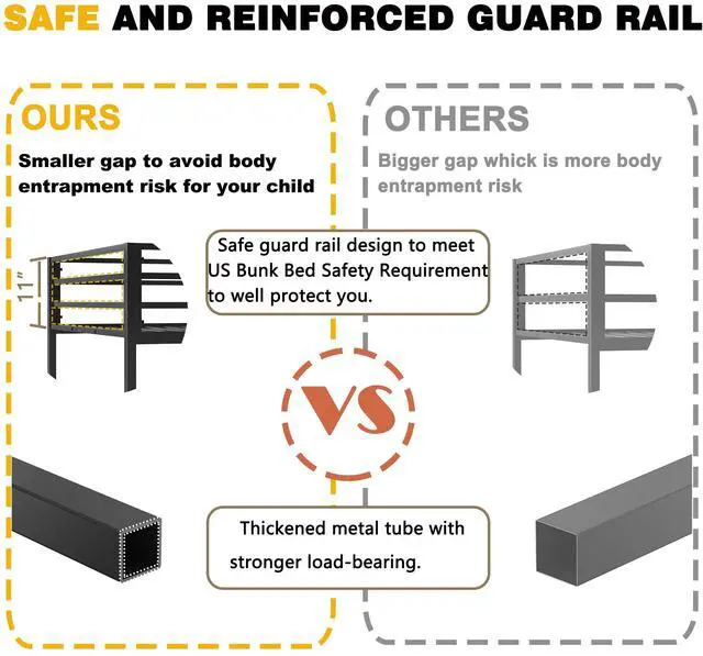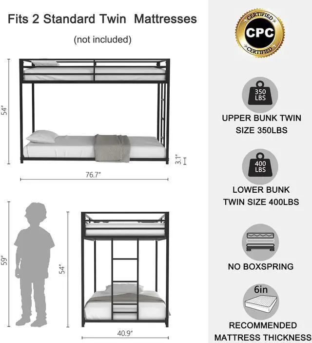 [Durable Square Tube Frame]: The sturdy square tube frame provides maximum support with a total weight capacity upper bed 350 lbs and lower bed 400 lbs, to ensure safety and stability for a quiet night's sleep.