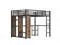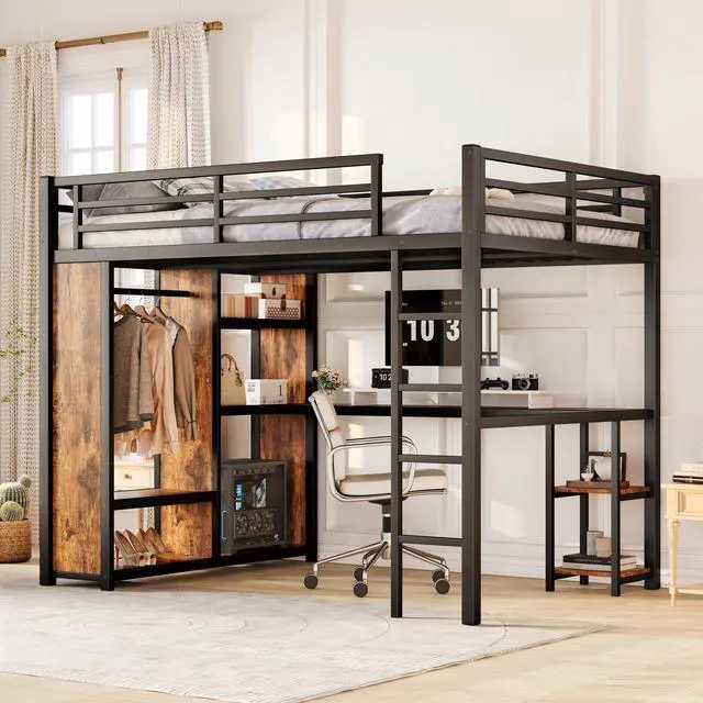 Queen Size Loft Bed Frame with Built-in Wardrobe, Metal Loft Bed with Desk and Storage Shelves, Woodgrain