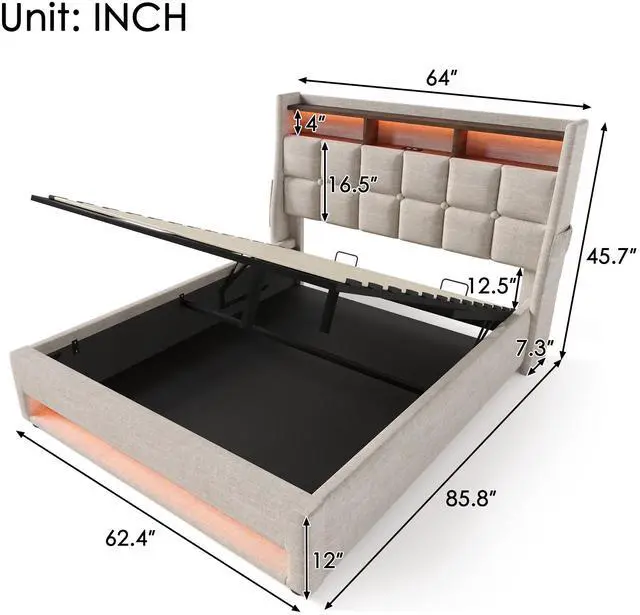 • Queen size Upholstered Platform bed with a Hydraulic Storage System, LED and USB Charging, Natural (without mattress)