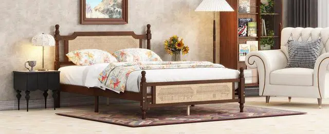 This masterpiece of rattan headboard bed enhances the natural vintage of any rooms it grants. This queen-size bed exemplifies the aesthetic appeal of the headboard and footboard, which adorned with spherical heads, thereby imbuing the furniture with a refined air of elegance. This bed equipped with sophisticated and elegant rattan-woven headboard. It harmoniously blends into any setting, offering a plain and rustic appeal, ideal for various decor styles.