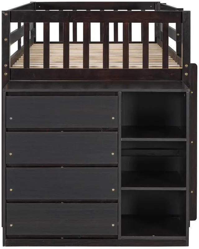 [Built-in design]This bunk bed features one twin size upper bunk and one twin size bottom bunk for accommodating you or any overnight sleepers. The drawers and shelves set can be placed on both sides of the bed according to customers needs.