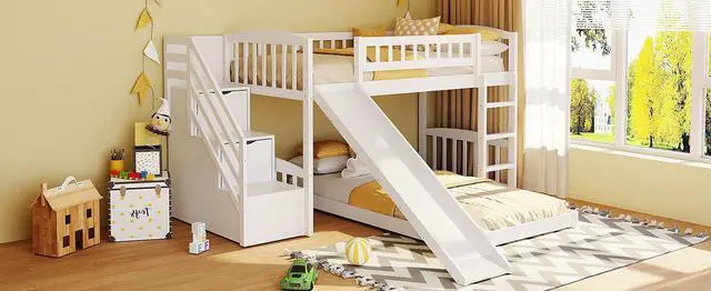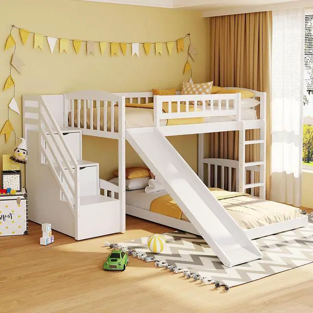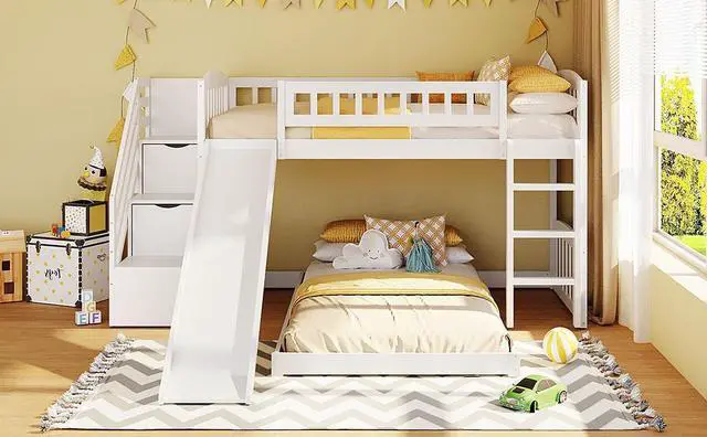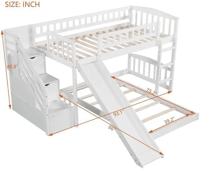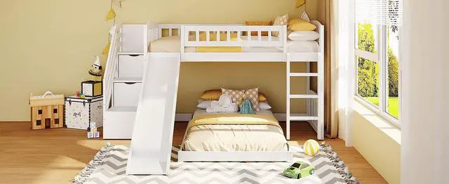[Convertible Ladder and Slide] With built-in ladder and staircase, it is easy for you to climb up and down from the top bed. Featuring a low slide for you to play, this bunk bed can add fun to you and develop your sense of balance and coordination. The slide and the ladder are convertible, both of them can be put left or right. What's more, the staircase with drawers can be put left or right.