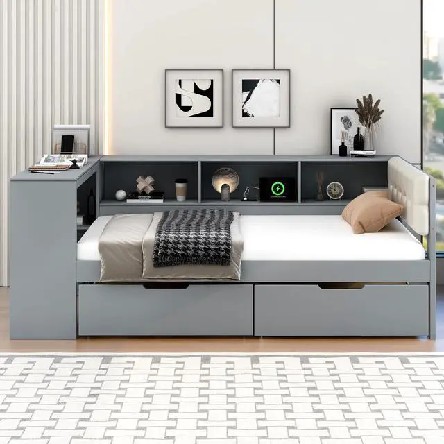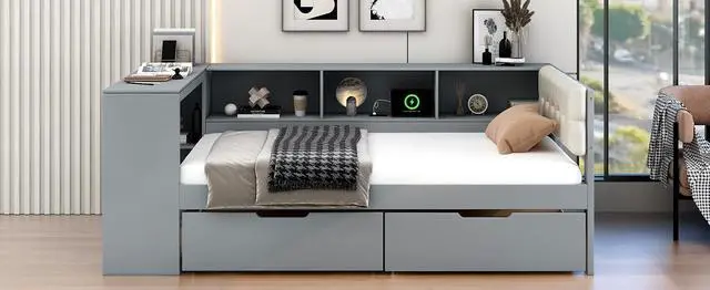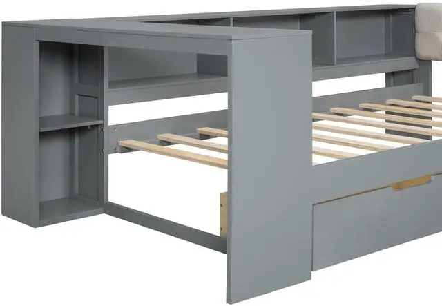 • Wood Twin Size Platform Bed with Storage Shelves, Drawers, Charging Station and Upholstered Headboard, Gray