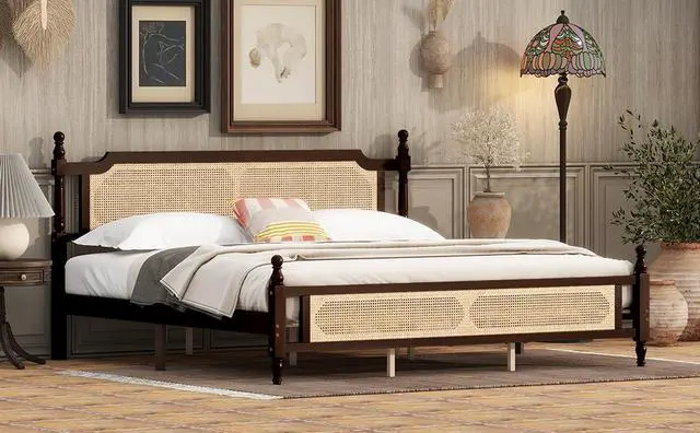 This masterpiece of rattan headboard bed enhances the natural vintage of any rooms it grants. This king-size bed exemplifies the aesthetic appeal of the headboard and footboard, which adorned with spherical heads, thereby imbuing the furniture with a refined air of elegance. This bed equipped with sophisticated and elegant rattan-woven headboard. It harmoniously blends into any setting, offering a plain and rustic appeal, ideal for various decor styles.