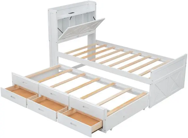Space-saving: The bed includes one trundle, which can be rolled out to provide extra sleeping space to put another twin size mattresses. This design is ideal for families with children or users who need to host guests frequently.