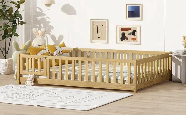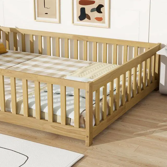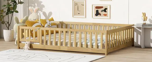 • Full Size Floor Bed with Fence and Door,Rubber Wood Floor Bed with Safety Guardrails,Natural(Old Sku W504P296787)
