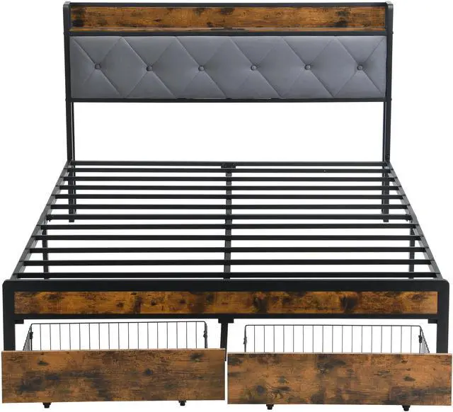 Bed Frame with led lighting, with remote controlStorage Headboard with Charging Station