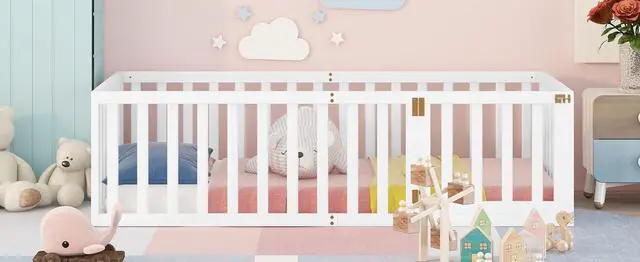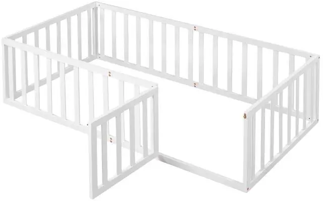 {Versatile floor bed}There is no bed slats. It is an open-row design. You can use it as a bed, or a child's play space, reading place and so on. Use your imagination to create your own fun space. {Sturdy and Durable Bed Frame}Crafted with superior quality solid pine wood bed frame, this floor bed frame is sturdy and solid for a lifetime use. {Fun Design}This wooden floor bed frame has a circle of fences. There is a small door that can be opened and closed, which increases the interest of the bed and creates a more safety sleeping space. {Easy to Assemble}The assembly instructions and required tools are delivered together with the bed frame. It is easy to assemble. It takes about 20 minutes for 1 people to assemble together. {Dimensions}Overall Product Dimension: 77.2" x 41.3" x 21.7" (L x W x H). Mattress not included. Some assembly is required, although we have provided clear instructions and tools.