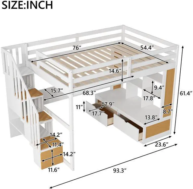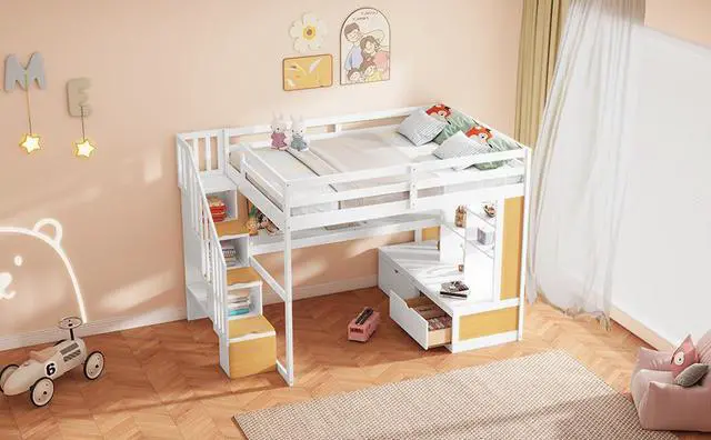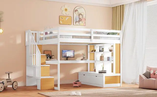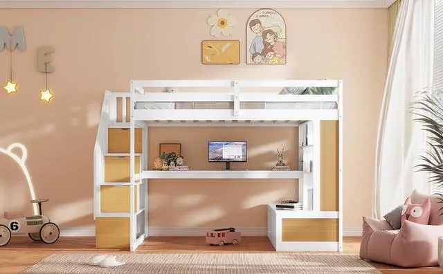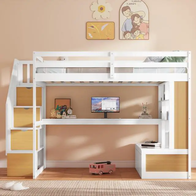 [Multifunctionl Design]This loft bed includes a desk, shelves storage staircase and two large storage drawers in one. Not only provides you with a place to work or study, but also provides a large storage space.