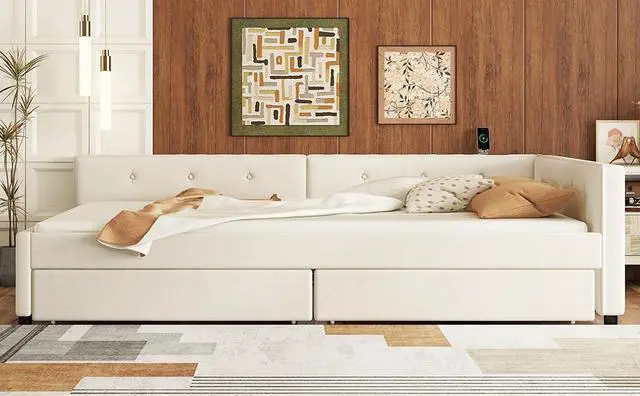 [Storage Drawers] There are 2 drawers on both sides under the bed. The bottom wheel design is easy for you to pull out and push in, keeping the room tidy.