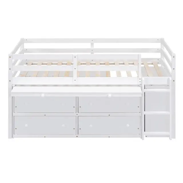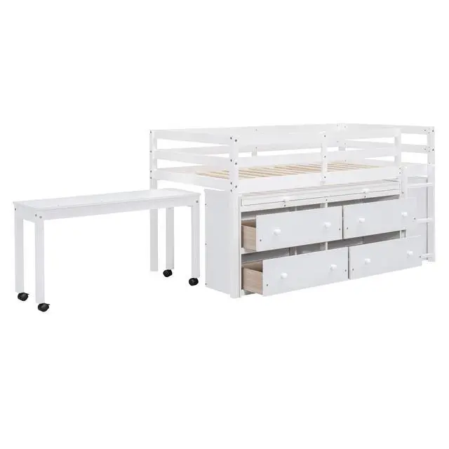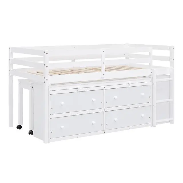 [Solid Construction] This muti-functional loft bed is crafted from a solid pine wood frame, with commercial grade MDF board for quality control and durability. Guardrails are solidly attached for added safety.
