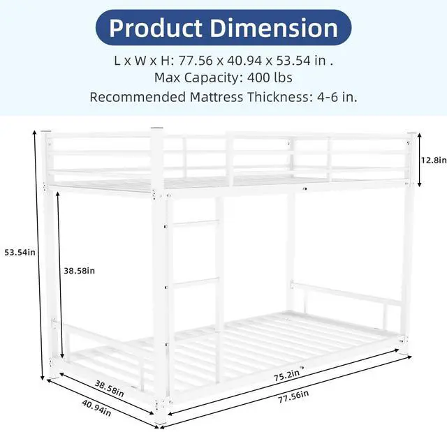 Able to split: This metal bunk bed can be converted in to two individual beds. A perfect addition for growing teens, allowing them the freedom and space to host friends. The bottom bunk clearance is 12 inches, you can put a storage box under the bed to tidy up the clothes, toys or quilts.