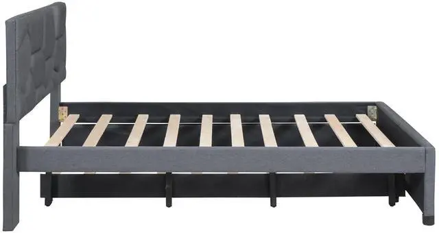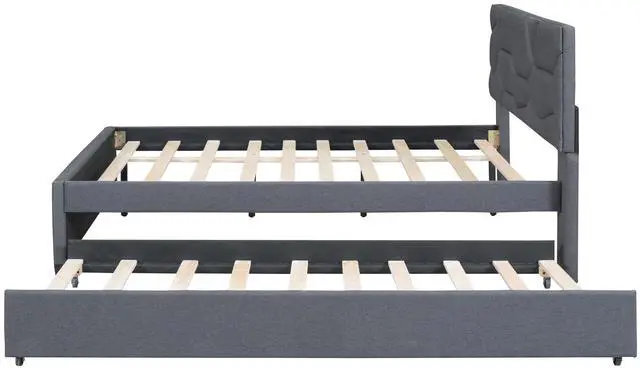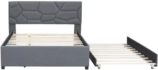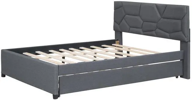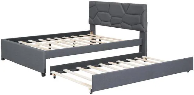 • Full Size Upholstered Platform Bed with Brick Pattern Headboard and Twin Size Trundle, Linen Fabric, Gray