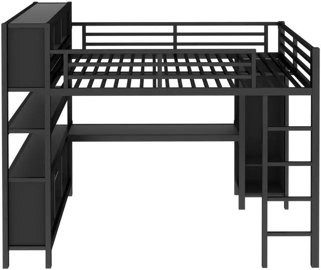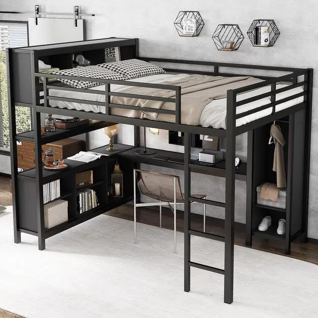 Queen Loft Bed with Wardrobe and Desk: This metal loft bed has a cozy sleeping space, a spacious and practical L-shaped desk that can be used as a workbench or reading area, and the wardrobe can provide a great place for your everyday clothes.