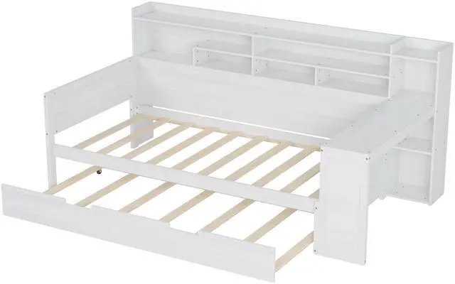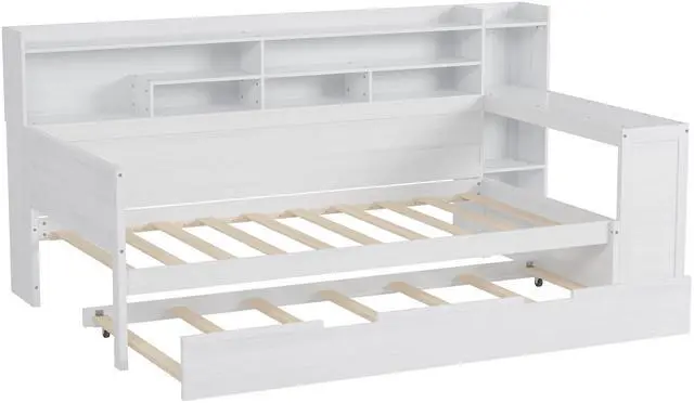• Wooden Twin Size Daybed with Storage Shelves, Multi-functional Bed with Twin Size Trundle Bed and Study Desk, Antique White(Old SKU: N733S242275K)