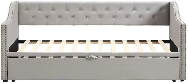 [Elegant design] Upholstered in carefully-selected velvet, in elegant gray/beige/pink, featured with backrest and two armrests, this daybed not only suits any home décor, but is timeless in its design. The soft backrest and armrests creates coziness, while the single color of the design creates versatility.