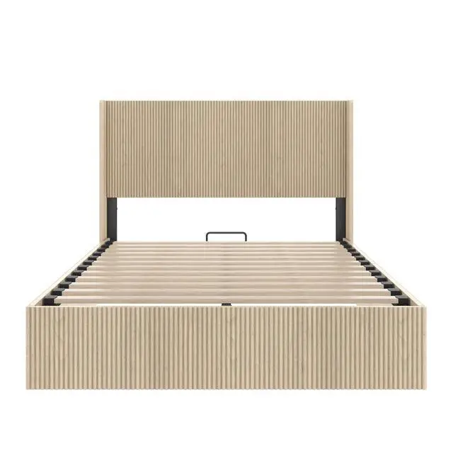 A large raised and undulating storage bed frame with grooves. The wooden platform bed frame has a storage function that can be lifted, without requiring a spring box / no noise. Oak color ( Queen)