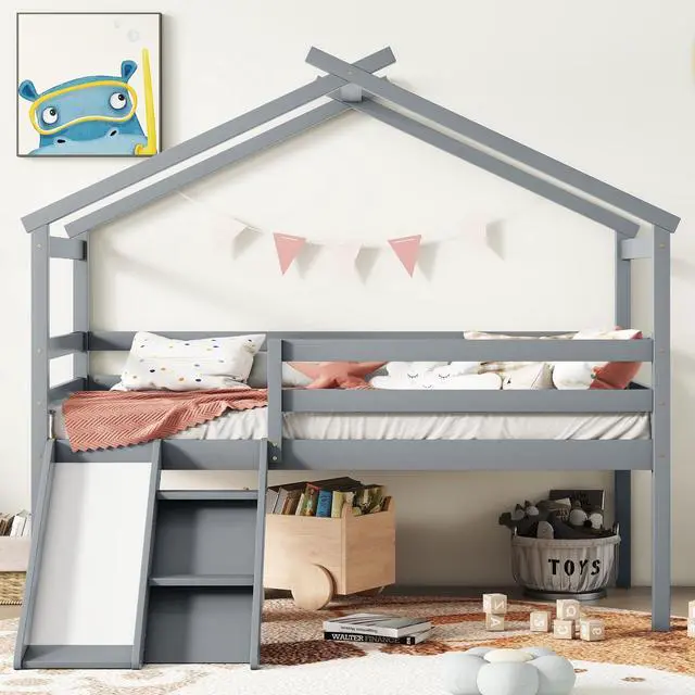 #4 [Stylistic Elements]The elegance of the bed is reflected from the contemporary minimalistic design of its structure of the paralleled slide and ladder. The unique design of wooden roof frame provides an endless imagination and access to the natural woods to have a fun and go to sleep. Various decorations can be hung up on that wood house frame to accompany a whole sleep and daily activities.