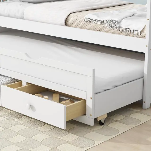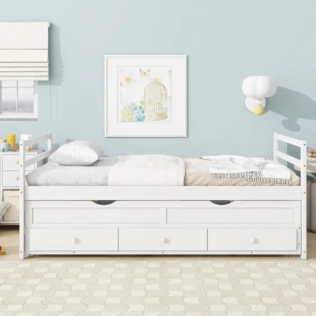 Twin Size Bed with Headboard, Footboard, Trundle and Three Storage Drawers, Twin Size Pine Wood Bed with Headboard, Footboard,White