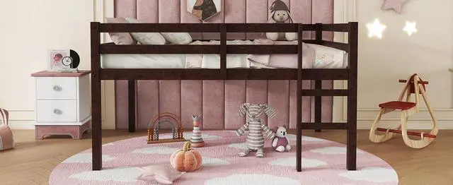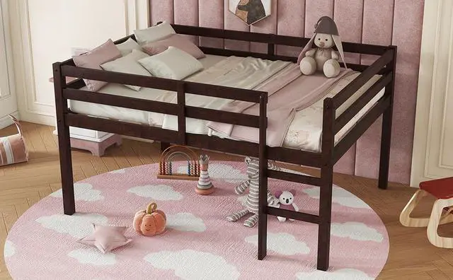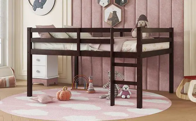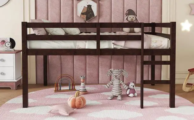 • Full Rubber Wood Loft Bed with Ladder,Espresso