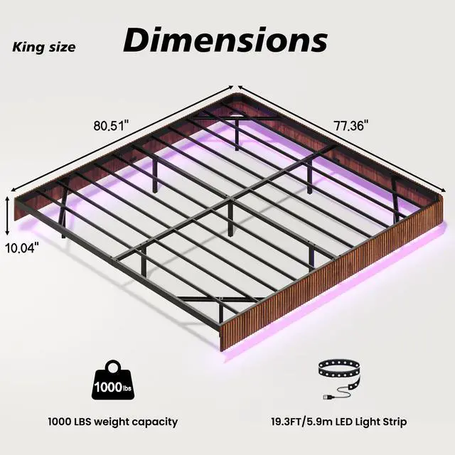 Smart Lighting Atmosphere System: Equipped with a 60, 000+ color-customizable LED strip, this bed frame allows easy adjustment via remote control or app. Enhanced by music-synced and sound-activated flickering functions, it enables one-touch scene switchingfrom romantic to tranquiltransforming your space into an immersive, cozy haven.