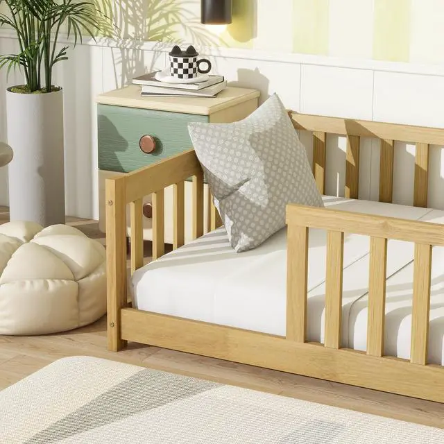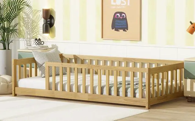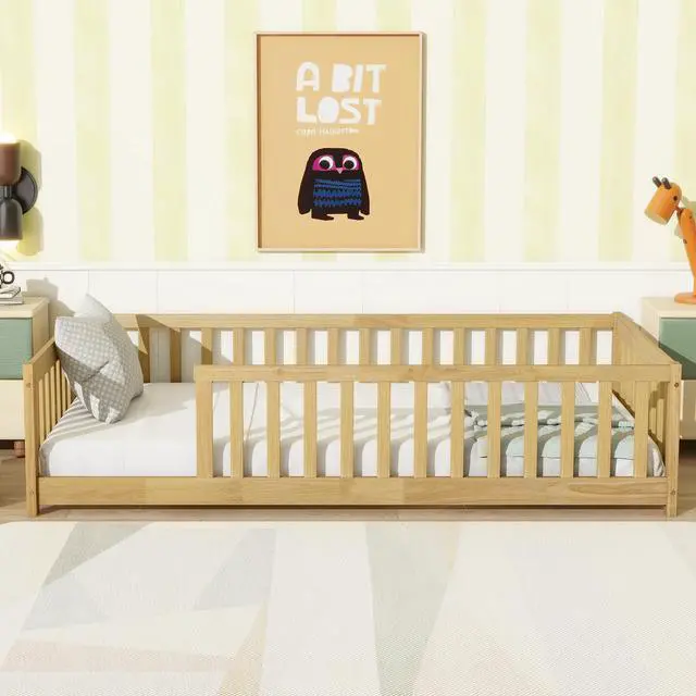 • Twin Size Floor Bed with Fence without Door, Rubber Wood Floor Bed with Safety Guardrails,Natural (Old Sku W504P296796)