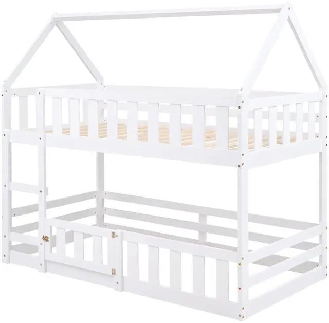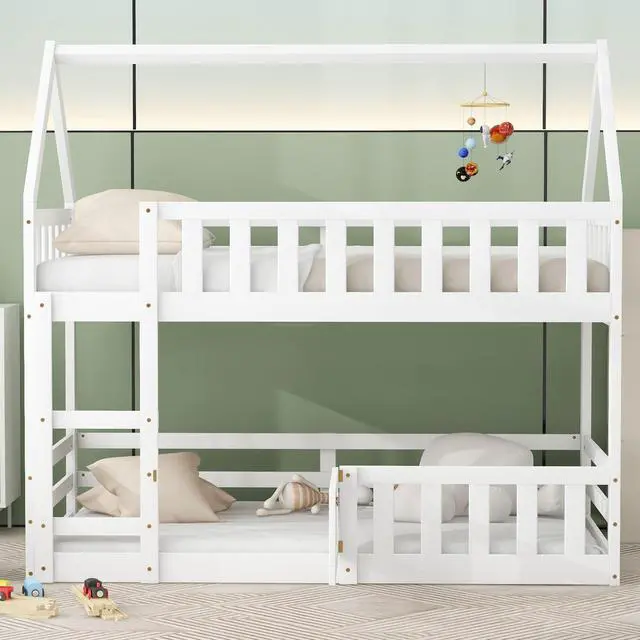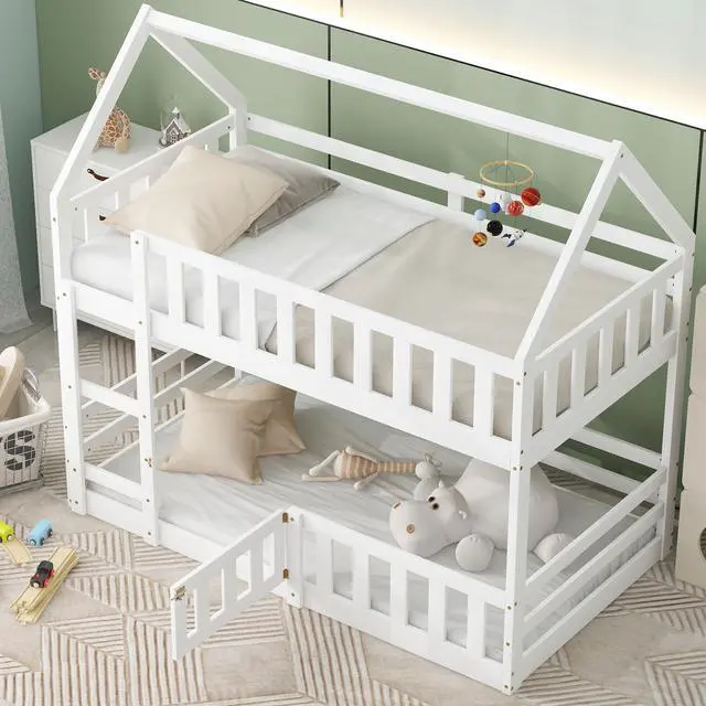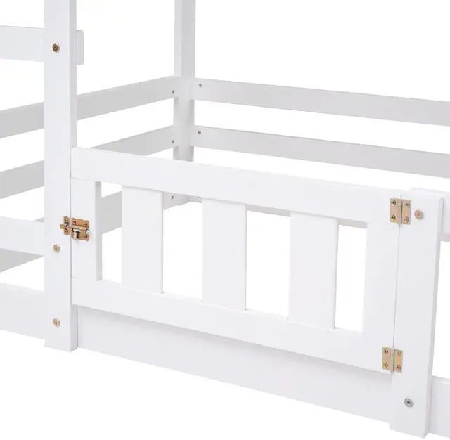[Fence-shaped Guardrail] With fence-shaped guardrails, this bunk bed offers a safe space for you to get a good night's sleep. There is a a small door of the down bed, so that kids can enter and exit freely through this small door.