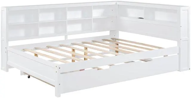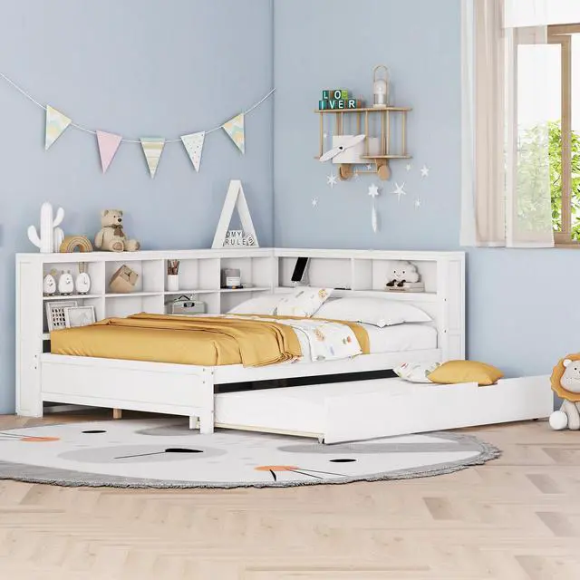 Space-saving: The daybed includes one trundle, which can be rolled out to provide extra sleeping space. This design is ideal for families with children or users who need to host guests frequently. There is a double-layer storage shelf next to the bed, where users can store bedding, toys and other items.