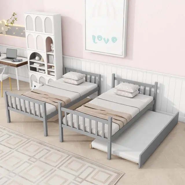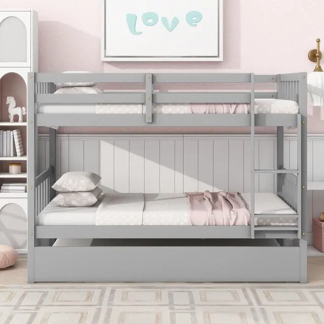 • Twin Over Twin Rubber Wood Bunk Bed with Trundle, Convertible into Twin Size Beds, Twin Size Bunk Bed with Ladder and Safety Guardrails,Grey