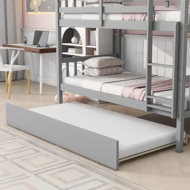 Twin Over Twin Rubber Wood Bunk Bed with Trundle, Convertible into Twin Size Beds, Twin Size Bunk Bed with Ladder and Safety Guardrails,Grey