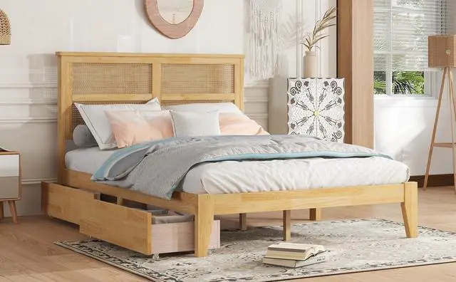 #1 [Unique Rattan Headboard]The distinctive intricately interwoven Rattan Headboard of this bed harmoniously infuse your bedroom décor with a vintage attraction and fostering a cozy yet fashionable ambiance. Moreover, the bed is an example of superior craftsmanship and long-lasting materials further elevating its overall aesthetic appeal.