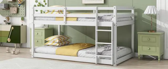 #1 [Twin over twin bed Design]The low height feature of this twin over twin bunk bed not only ensures better stability but also increases versatile utilization. The unique design offers diverse sleeping preference as well as optimizing storage space. The ladder is crafted with a wider width to provide more spacious steps and solid support, making it easier for you to climb up and down the ladder.