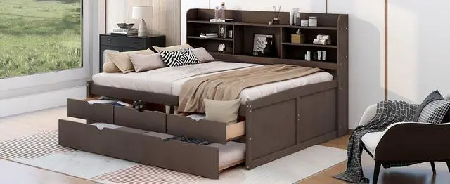 [Built-in Bookshelves] Four side compartments and one large middle for storage; Freestanding design can be used with any style of bed and does not need to be attached.