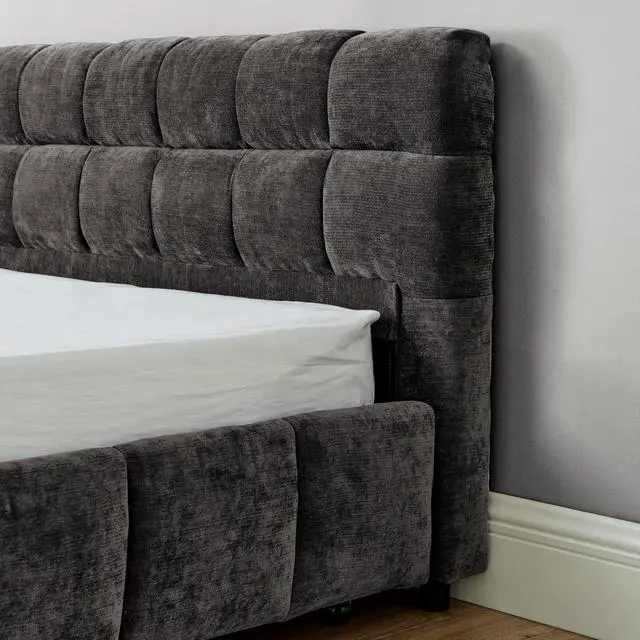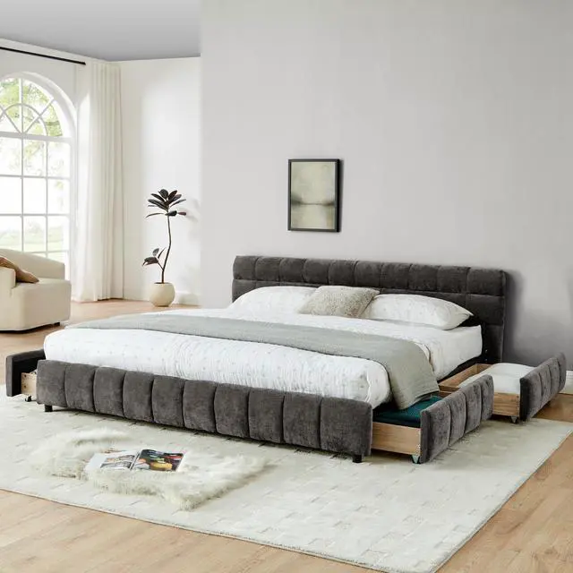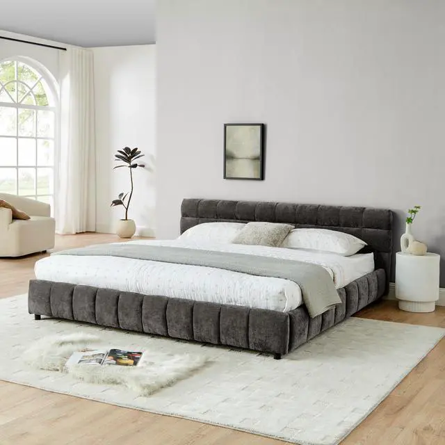 [Unique Grounded King Size Bed] - This grounded upholstered bed will be both a beautiful piece in the room and a place full of fun for your family. This beautiful modern King bed frame adds a contemporary chic look to your bedroom and is upholstered in thick chenille fabric to add extra comfort.