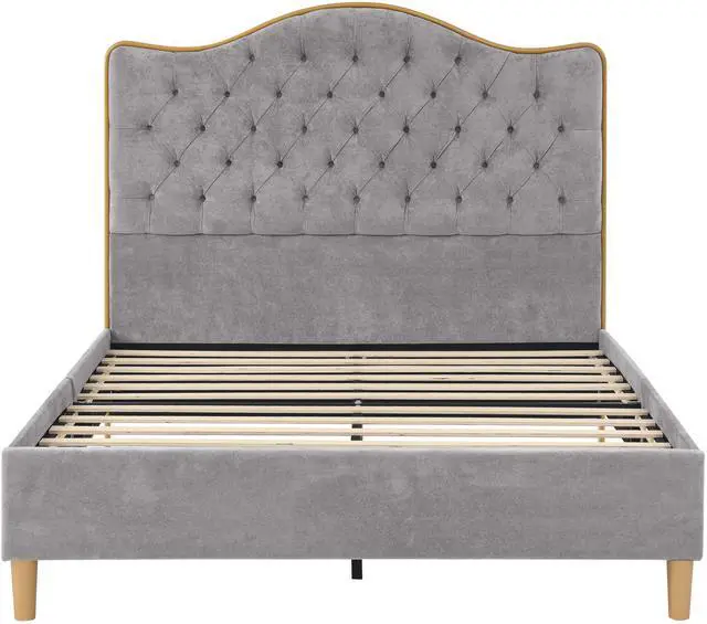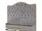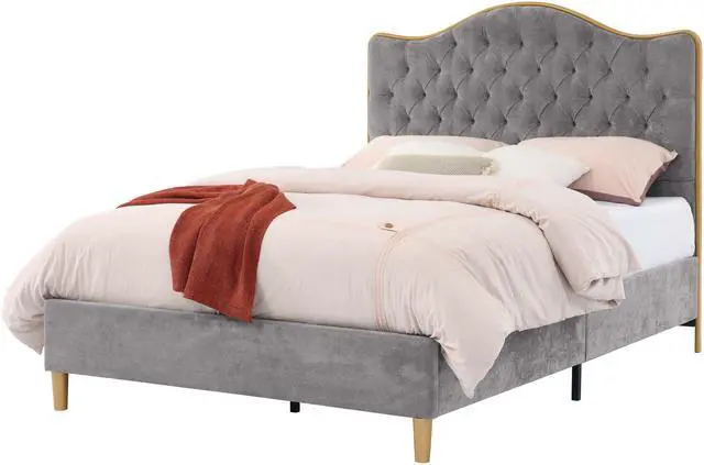 This sophisticated piece features a tufted headboard with a classic curved design and a soft, luxurious fabric finish, adding a touch of elegance to any space.