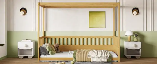 Children's Style Drop-down Roof BedThis wooden canopy bed is equipped with full-length support at the top. You can add curtains that your child likes to create a cozy sleeping space, or decorate this drop-down bed with colorful flags, lights or photos...